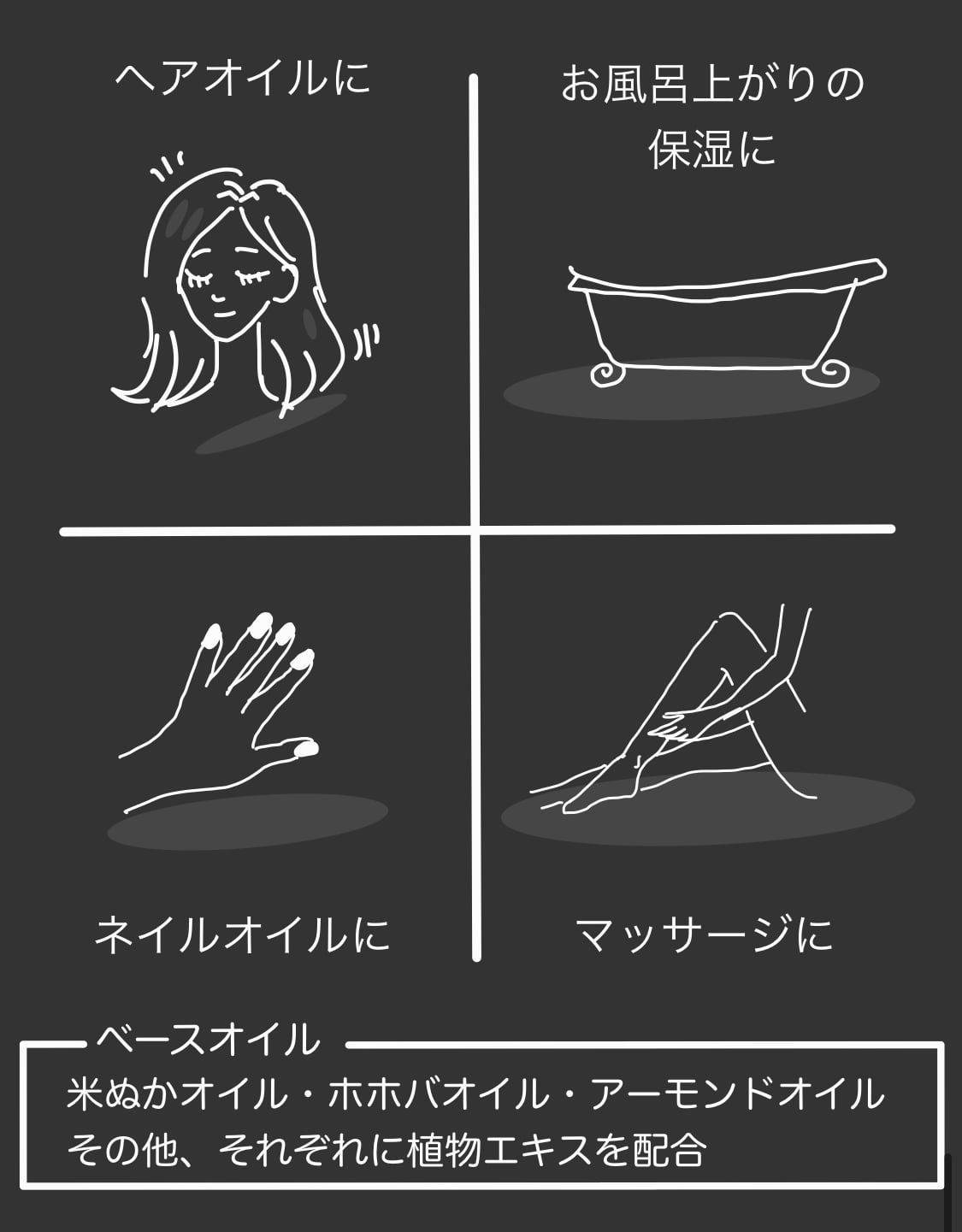 注目の濡れ髪スタイルやヘアオイルとしてもオススメ。お風呂上がりにボディの保湿オイルとしても。